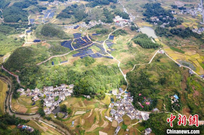 Photo shows an aerial view of edible fungus greenhouses in Xiangchehe village, Anlong county, southwest China's Guizhou province. (Photo/Chinanews.com)