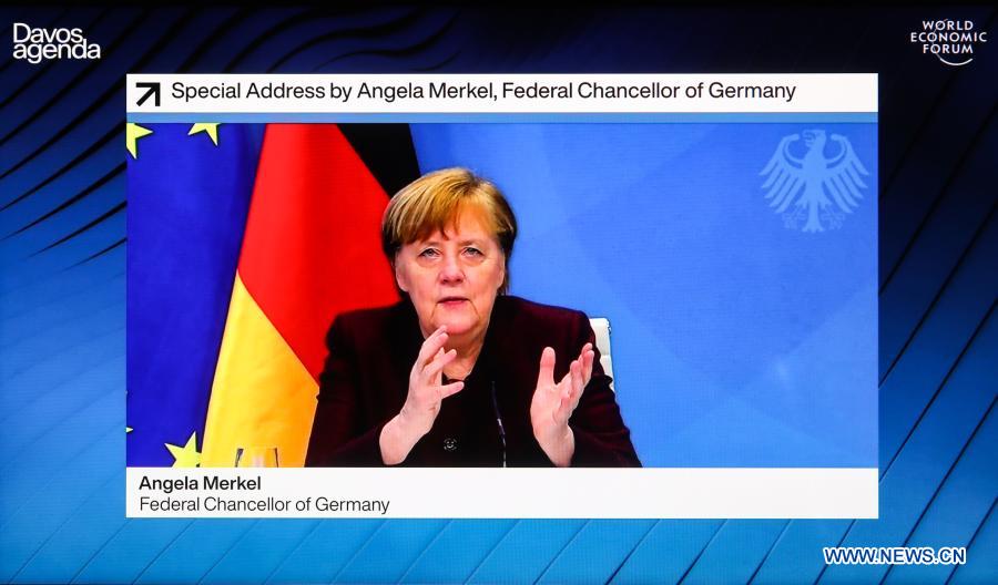 Photo taken in Berlin, Germany, on Jan. 26, 2021 shows a screen displaying German Chancellor Angela Merkel delivering a speech at the virtual World Economic Forum (WEF). Merkel on Tuesday called for a "fair" and rapid distribution of coronavirus vaccines across the world, including the poorer countries. (Xinhua/Shan Yuqi)