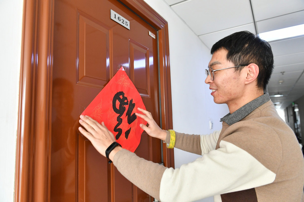 A student pastes the Chinese character "Fu" meaning good fortune on the door of his dormitory in Shaanxi Normal University, Xi'an, Shaanxi province, on Jan 19, 2021. (Photo/Xinhua)