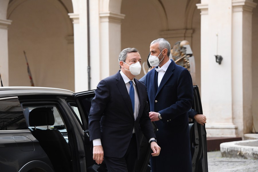 Former chief of European Central Bank (ECB) Mario Draghi (L) arrives at the Palazzo del Quirinale for a meeting with Italian President Sergio Mattarella in Rome, Italy, Feb. 3, 2021. (Pool via Xinhua)