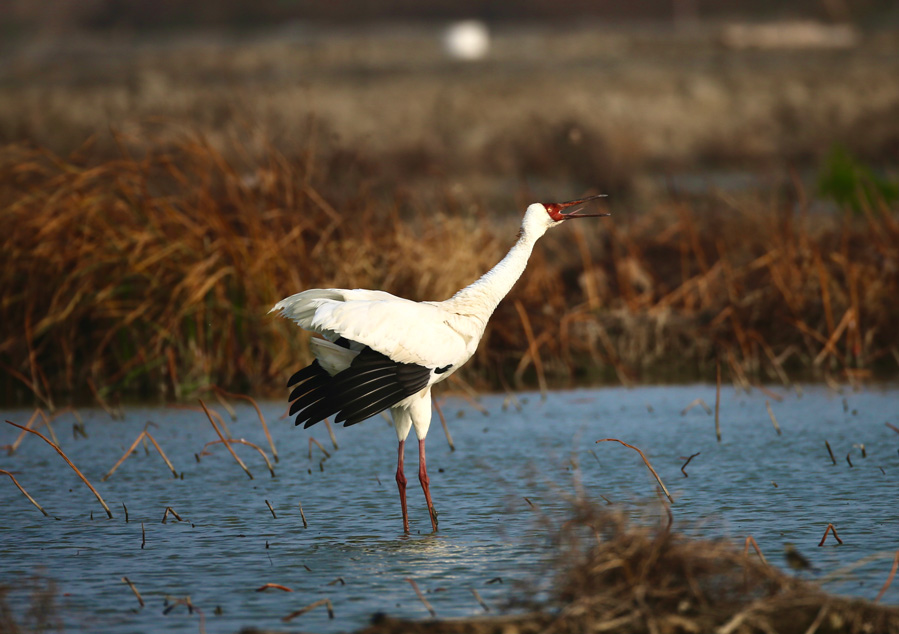 A white crane forages in shoals in Shishi Wetland Park, Quanzhou, southeast China's Fujian Province. (People's daily Online/ Tian Mi)