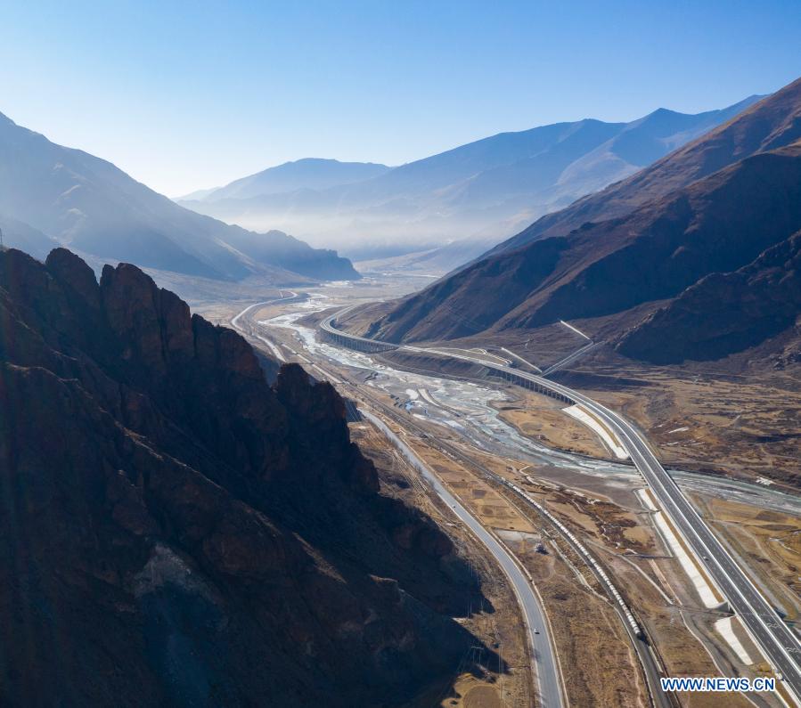 Aerial photo taken on Jan. 28, 2021 shows a section of the No.109 national highway, the Qinghai-Tibet railway, and a high-grade highway (L to R) between Lhasa and Nagqu in southwest China's Tibet Autonomous Region. The road network in Tibet Autonomous Region now stretches over 117,000 km, up 50 percent from the end of 2015, as the region continues to see improving connectivity. The mileage of the rail network in the region has reached 954 km, according to data released recently. Since late 2012, China has been strengthening its infrastructure investment in Tibet. So far, roads have connected 95 percent of the township-level administrations and 75 percent of the incorporated villages in the region. (Xinhua/Sun Fei)