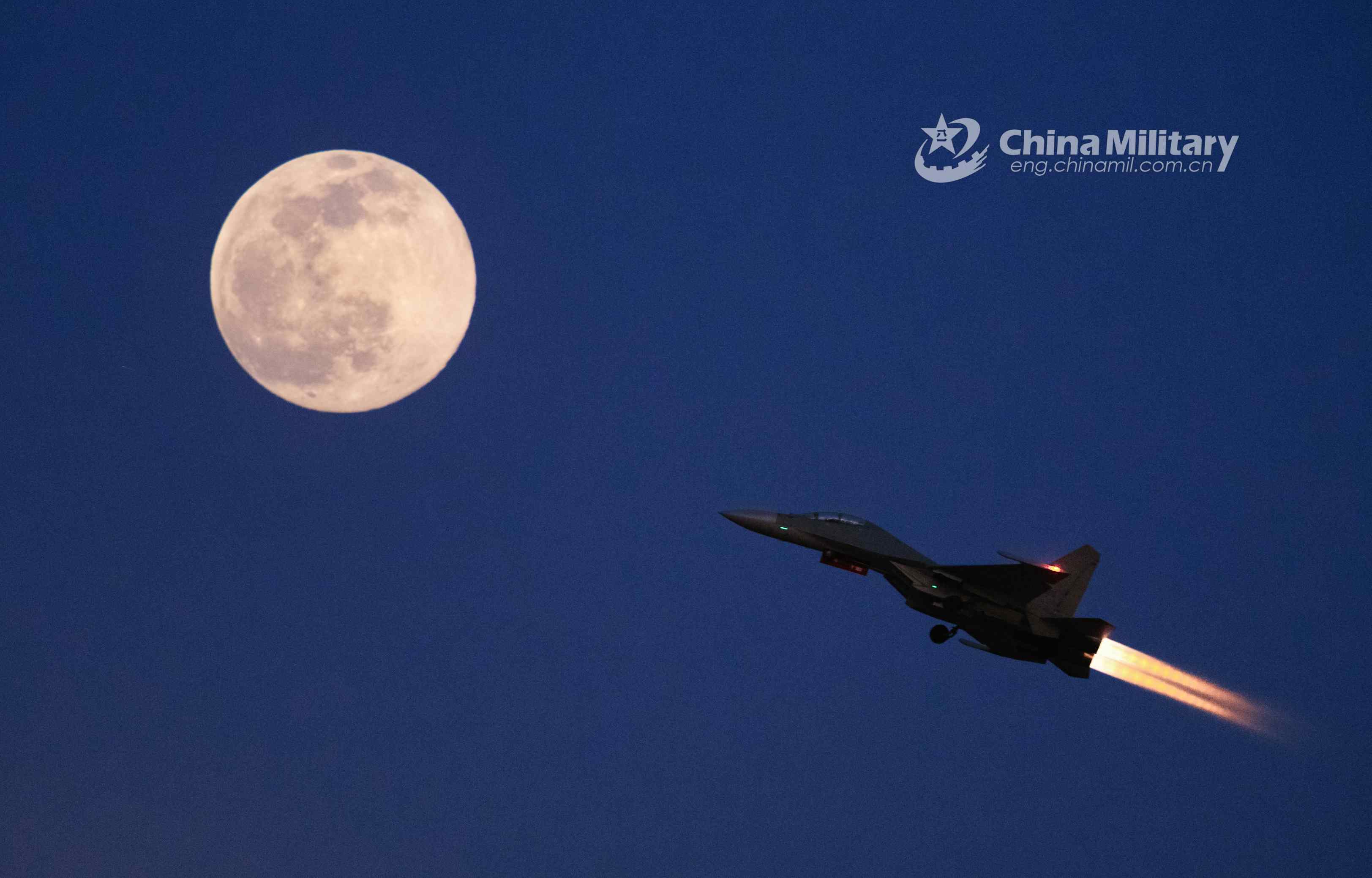 The double-exposed shot shows a fighter jet silhouetted against a super full moon during a 24-hour flight training exercise from January 27 to 28, 2021. The jet is attached to an aviation regiment under the PLA Air Force. (eng.chinamil.com.cn/Photo by Xu Chentong)