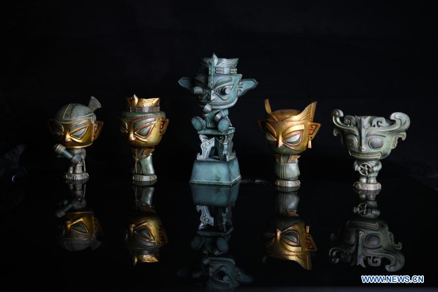 Toy figures are pictured at Zeng Zhou's workshop in Chengdu, southwest China's Sichuan Province, Feb. 4, 2021. Zeng Zhou is a 31-year-old independent designer working on toy figure design. Inspired by a visiting experience at Sanxingdui Museum in Sichuan, Zeng decided to design model figures imitating bronze relics of the Sanxingdui Ruins, which are believed to be remnants of the Shu Kingdom dating back 2,600 years to 4,800 years, blending traditional Chinese culture with fashion toys. Zeng Zhou is now dedicated to optimizing his design and promoting mass production of his toy figures. "I hope more collections of cultural relics of our country could be displayed by means of trendy, stylish designs," Zeng Zhou said. (Xinhua/Wang Xi)