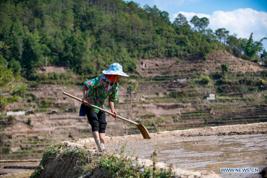 A farmer works in Hani terraced fields in Sancun Township of Honghe County, southwest China's Yunnan Province., Feb. 4, 2021. (Xinhua/Chen Xinbo)
