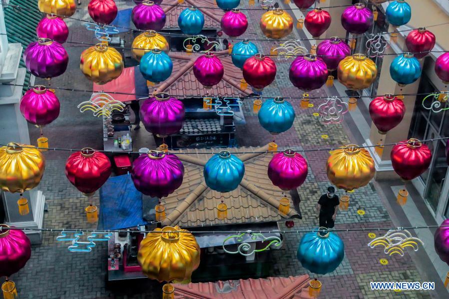 Chinese lanterns are placed for the upcoming Spring Festival, or the Chinese Lunar New Year, at a shopping street in Manila, the Philippines, Feb. 7, 2021. (Xinhua/Rouelle Umali)