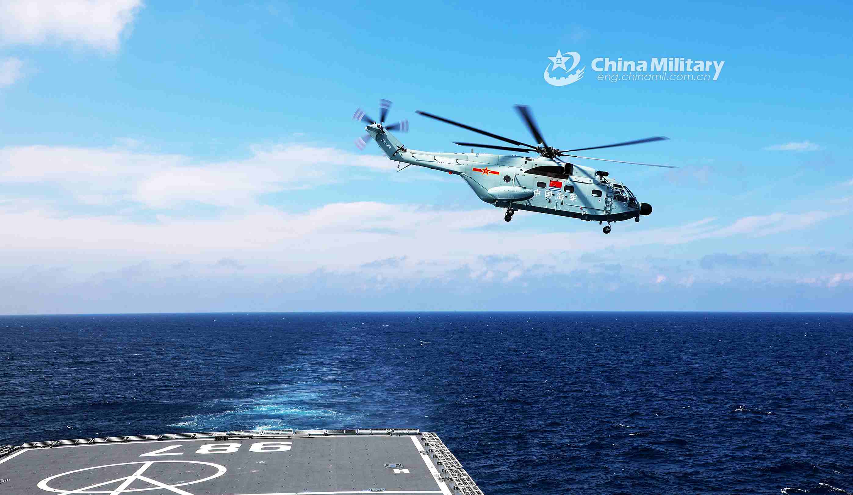 A ship-borne Z-8 transport helicopter attached to a landing ship flotilla with the navy under the PLA Southern Theater Command lifts off from the flight deck of the amphibious dock landing ship Wuzhishan (Hull 987) on January 26, 2021. The landing ship flotilla conducted a maritime coordinated training exercise on that day, including such training items as long-distance transport of landing troops and day-and-night helicopter take-off and landing, etc. (eng.chinamil.com.cn/Photo by Qiao Chenxi)