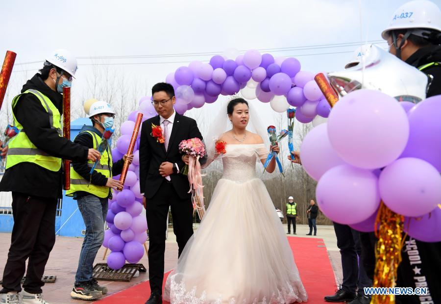 Jiang Jifeng and Zhang Xiaoju hold a wedding at a construction site in Hefei, east China's Anhui Province, Feb. 8, 2021. The 27-year-old Jiang Jifeng is a technician of China Construction Fifth Engineering Bureau. At the beginning of 2020, Jiang and his fiancee Zhang Xiaoju cancelled their wedding for the sake of the prevention and control of the COVID-19 epidemic. Jiang has been busy working on the construction site since the cancellation a year ago. The couple decided to hold their wedding on the construction site ahead of the Spring Festival, as they chose to stay put over the Spring Festival holiday to reduce the risk of COVID-19 infections during the travel rush. (Xinhua/Liu Junxi)