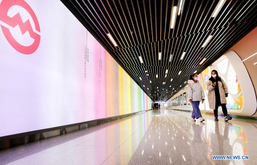 Passengers walk in a corridor of Wuzhong Road Station of Shanghai Subway Line 15 in Shanghai, east China, Feb. 9, 2021. The Shanghai Subway Line 15 started trial operation on Jan. 23. (Xinhua/Fang Zhe)