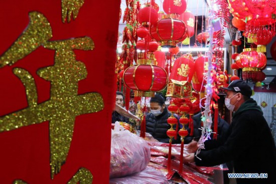 Customers purchase decorations for the upcoming Chinese Lunar New Year in Nanjing City, east China's Jiangsu province, Feb. 10, 2021. (Photo by Sun Zhongnan/Xinhua)