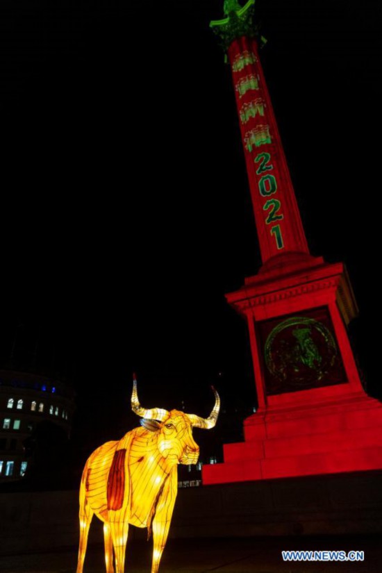 Photo taken on Feb. 10, 2021 shows the Nelson's Column illuminated in red and a light installation of ox to celebrate the forthcoming Chinese Lunar New Year, the Year of the Ox, at Trafalgar Square in London, Britain. (Xinhua/Han Yan)