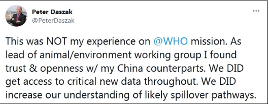 "This was NOT my experience on WHO mission. As lead of animal/environment working group I found trust & openness with my China counterparts. We DID get access to critical new data throughout," wrote Peter Ben Daszak on Twitter.