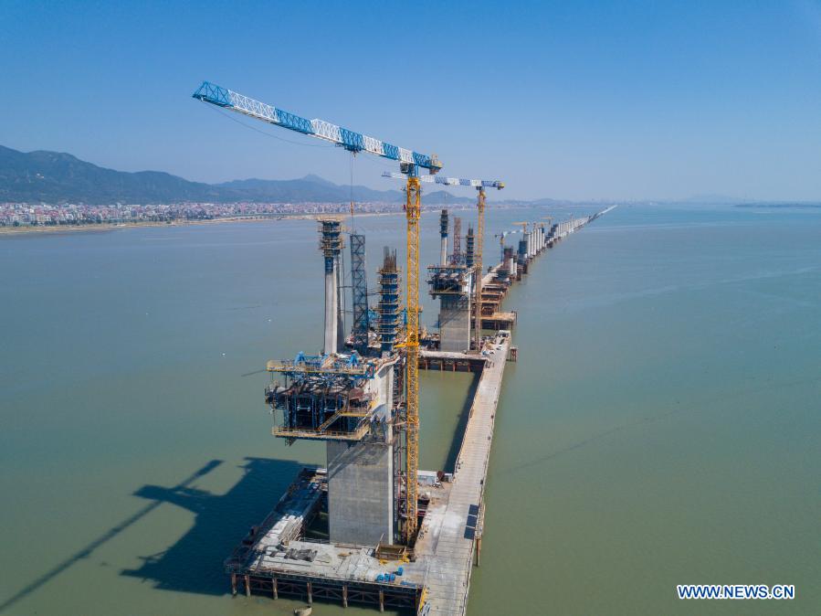 Aerial photo taken on Feb. 15, 2021 shows the construction site of Meizhou Bay cross-sea bridge of the Fuzhou-Xiamen high-speed railway in southeast China's Fujian Province. Some 500 laborers still work at the construction site of the bridge during the Chinese Lunar New Year. The 14.7-km-long bridge is part of the province's Fuzhou-Xiamen high-speed railway, the first cross-sea high-speed railway in China, which is expected to be put into operation in 2022. (Xinhua/Song Weiwei)