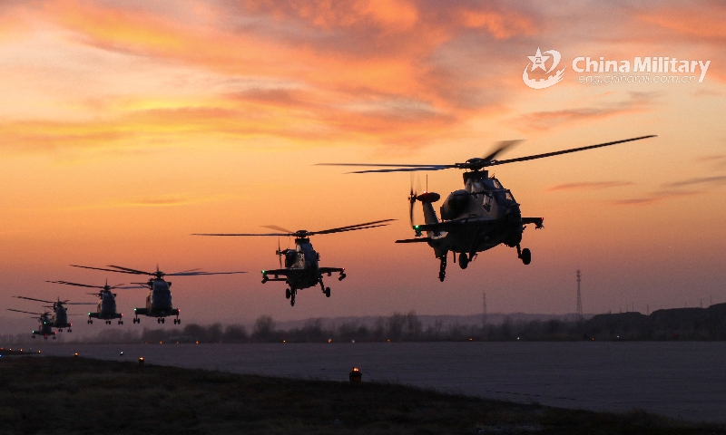 A cluster of attack and transport helicopters attached to an army aviation brigade under the PLA 76th Group Army conduct hover checks before leaving for a 24-hour flight task on February 2, 2021. (eng.chinamil.com.cn/Photo by Yang Mingfu)