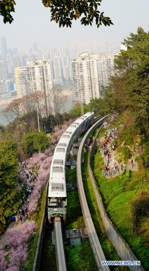 A monorail train runs past blooming flowers at Fotuguan section of Chongqing metro line 2 in southwest China's Chongqing Municipality, Feb. 23, 2021. (Xinhua/Liu Chan)