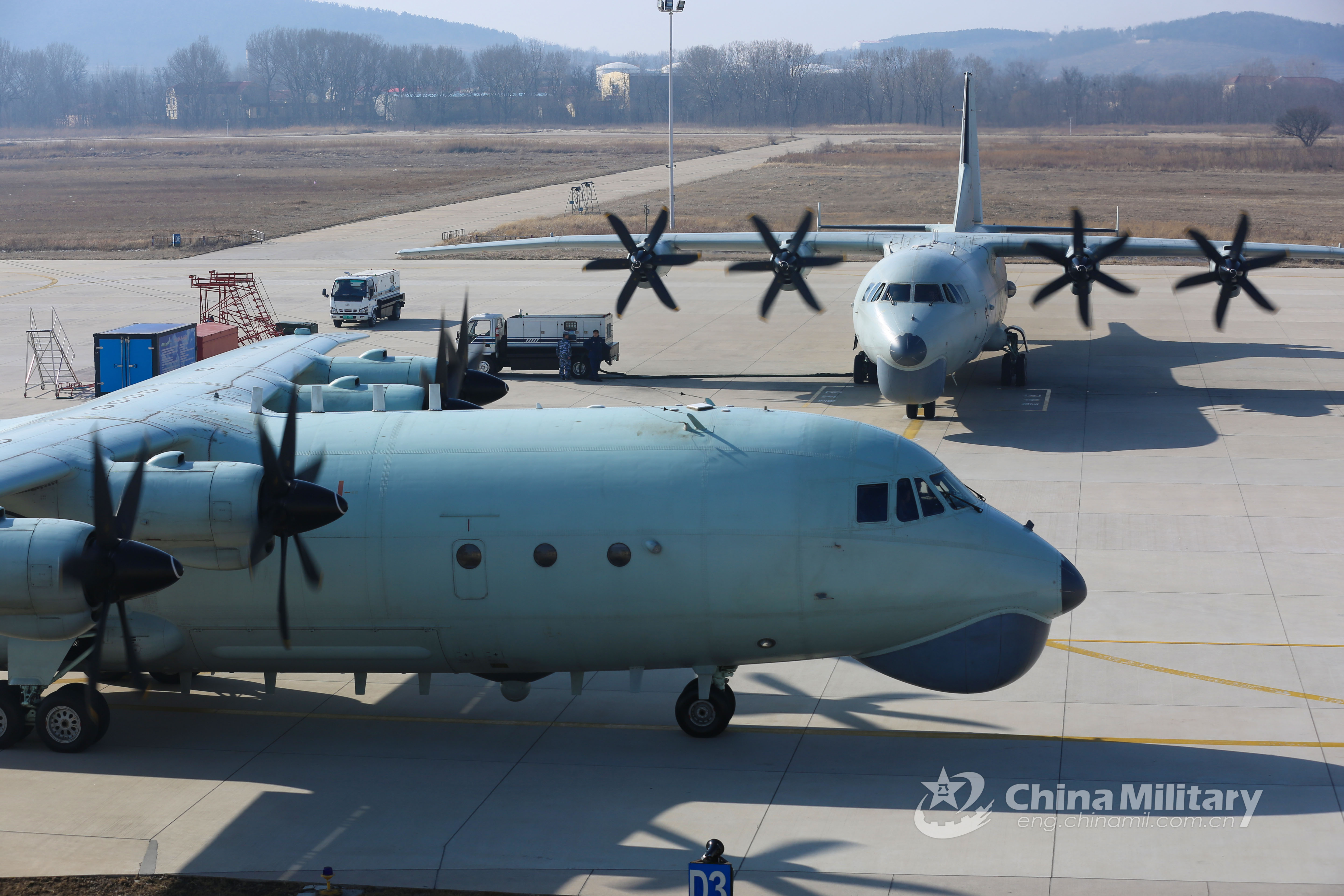 Two antisubmarine patrol aircraft attached to a naval aviation regiment under the PLA Northern Theater Command receive examination at the parking apron of a military airport in Liaodong Peninsula before the first flight training after Spring Festival holiday on February 20, 2021. (eng.chinamil.com.cn/Photo by Fu Dongchen and Bu Lingbin)