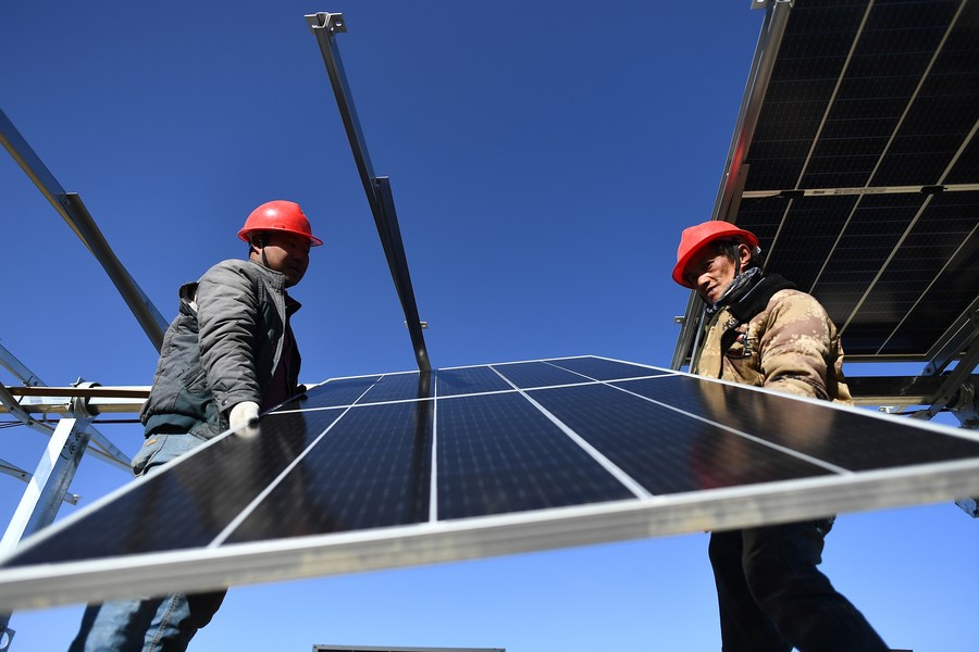 Workers install a solar power unit at the construction site of a 300-MW photovoltaic electricity project of the China Datang Corporation Ltd. in Gonghe County, Tibetan Autonomous Prefecture of Hainan in northwest China's Qinghai Province, Dec. 15, 2020. (Xinhua/Zhang Hongxiang)
