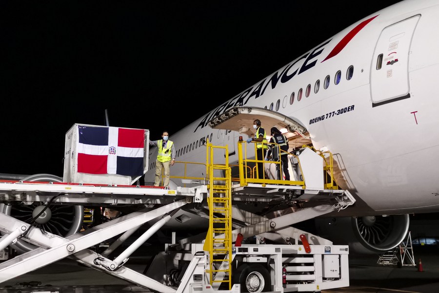 Staff members unload a batch of China's Sinovac COVID-19 vaccines from the plane at the international airport of Santo Domingo, the Dominican Republic, Feb. 23, 2021. (Photo by Sun Ning/Xinhua)
