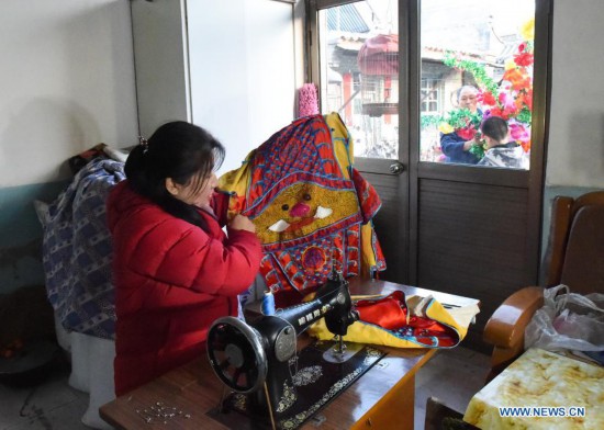 Hao Laixi's daughter-in-law makes costumes for the Ekou Naoge performance in Haojie Village of Daixian County, north China's Shanxi Province, Feb. 22, 2021. 73-year-old Hao is an inheritor of the national intangible cultural heritage Ekou Naoge performance, an art form integrating dancing, music, art with acrobatics. It is a local tradition to perform Ekou Naoge during the celebration of the Lantern Festival. This year, Hao decided to present an online performance for the festival at the suggestion of his son and grandson. (Xinhua/Chai Ting)