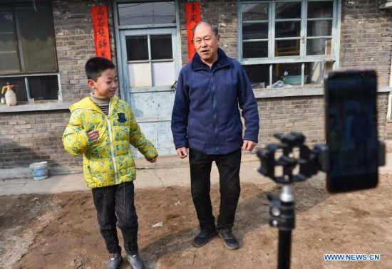 Hao Laixi (R) and his grandson introduce Ekou Naoge performance via live streaming in Haojie Village of Daixian County, north China's Shanxi Province, Feb. 24, 2021. 73-year-old Hao is an inheritor of the national intangible cultural heritage Ekou Naoge performance, an art form integrating dancing, music, art with acrobatics. It is a local tradition to perform Ekou Naoge during the celebration of the Lantern Festival. This year, Hao decided to present an online performance for the festival at the suggestion of his son and grandson. (Xinhua/Chai Ting)