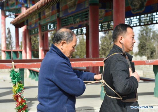Hao Laixi (L) helps his son Hao Yongjun prepare the stage properties for Ekou Naoge performance at a park in Daixian County, north China's Shanxi Province, Feb. 22, 2021. 73-year-old Hao is an inheritor of the national intangible cultural heritage Ekou Naoge performance, an art form integrating dancing, music, art with acrobatics. It is a local tradition to perform Ekou Naoge during the celebration of the Lantern Festival. This year, Hao decided to present an online performance for the festival at the suggestion of his son and grandson. (Xinhua/Chai Ting)