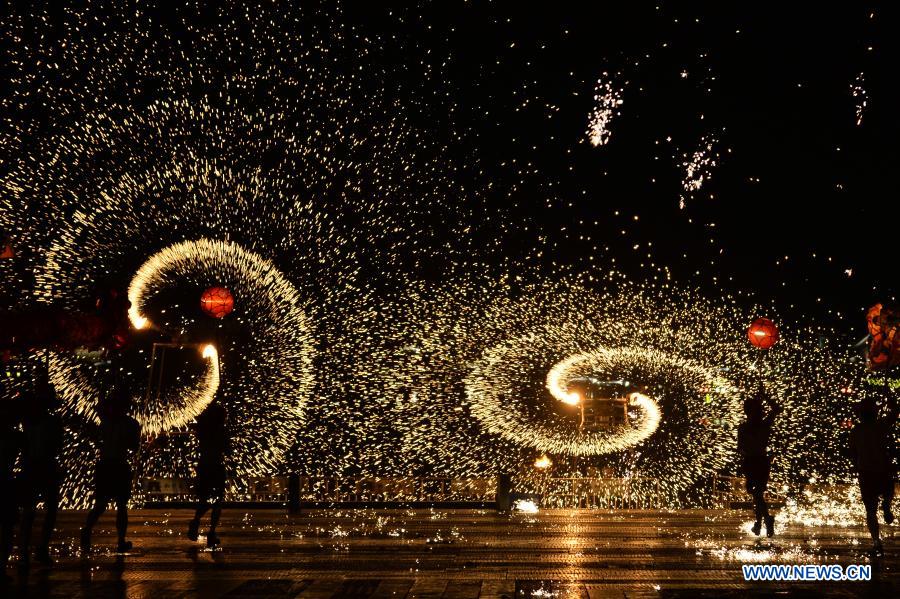 People enjoy "iron flowers," a folk art performance of throwing molten iron to create fireworks, in Changsha, capital of central China's Hunan Province, Feb. 26, 2021. Various activities were held across China to celebrate the Lantern Festival on Friday, the 15th day of the first month of the Chinese lunar calendar. (Xinhua/Chen Zhenhai)
