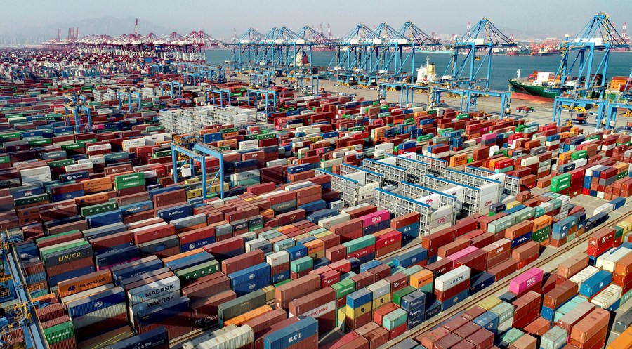 Aerial photo taken on Feb. 19, 2021 shows containers at the automatic dock of the Qingdao port in Qingdao, east China's Shandong Province. (Photo by Zhang Jingang/Xinhua)