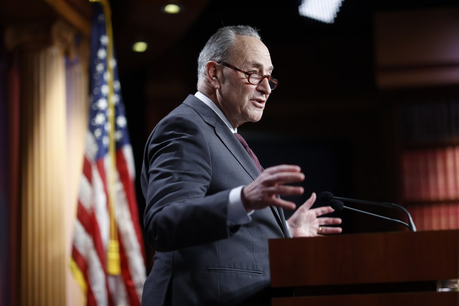 U.S. Senate Majority Leader Chuck Schumer speaks during a press conference on Capitol Hill in Washington D.C., the United States, Feb. 2, 2021. (Photo by Ting Shen/Xinhua)