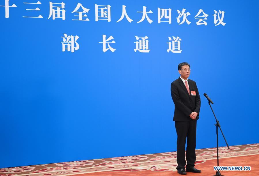 Minister of Finance Liu Kun gives an interview via video link after the opening meeting of the fourth session of the 13th National People's Congress (NPC) in Beijing, capital of China, March 5, 2021. (Xinhua/Chen Yehua)