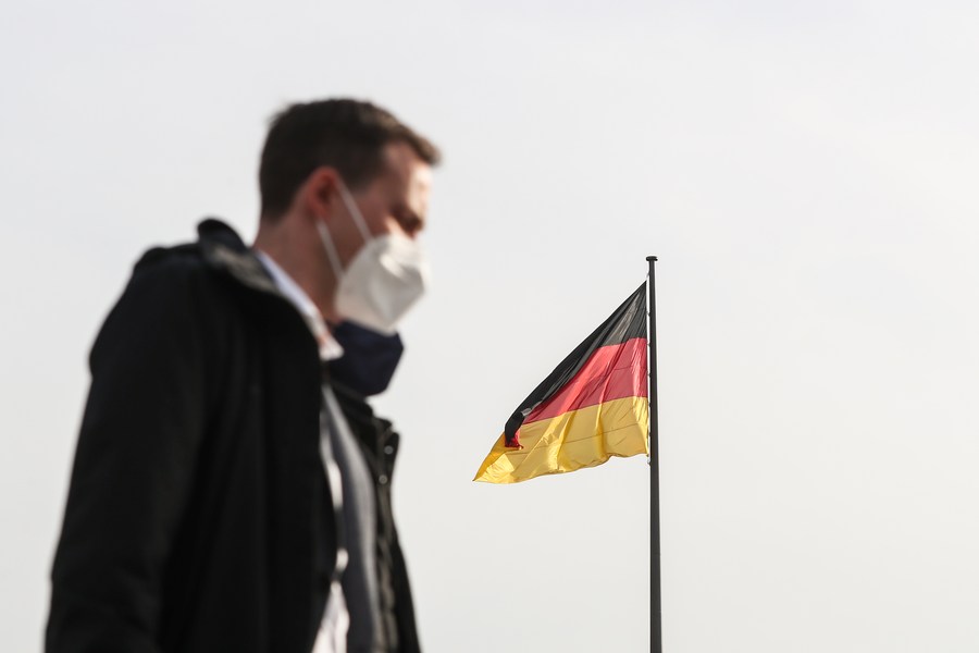 A pedestrian wearing face mask walks past a German national flag in Berlin, Germany, March 3, 2021. (Xinhua/Shan Yuqi)