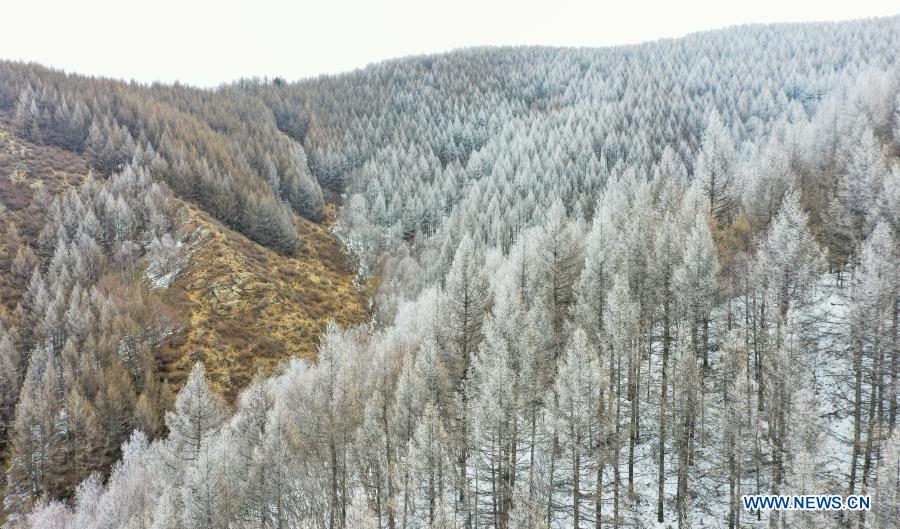 Aerial photo taken on March 5, 2021, shows the snow covered Sumu Mountain in Xinghe County of Ulanqab, north China's Inner Mongolia Autonomous Region. (Xinhua/Liu Yide)