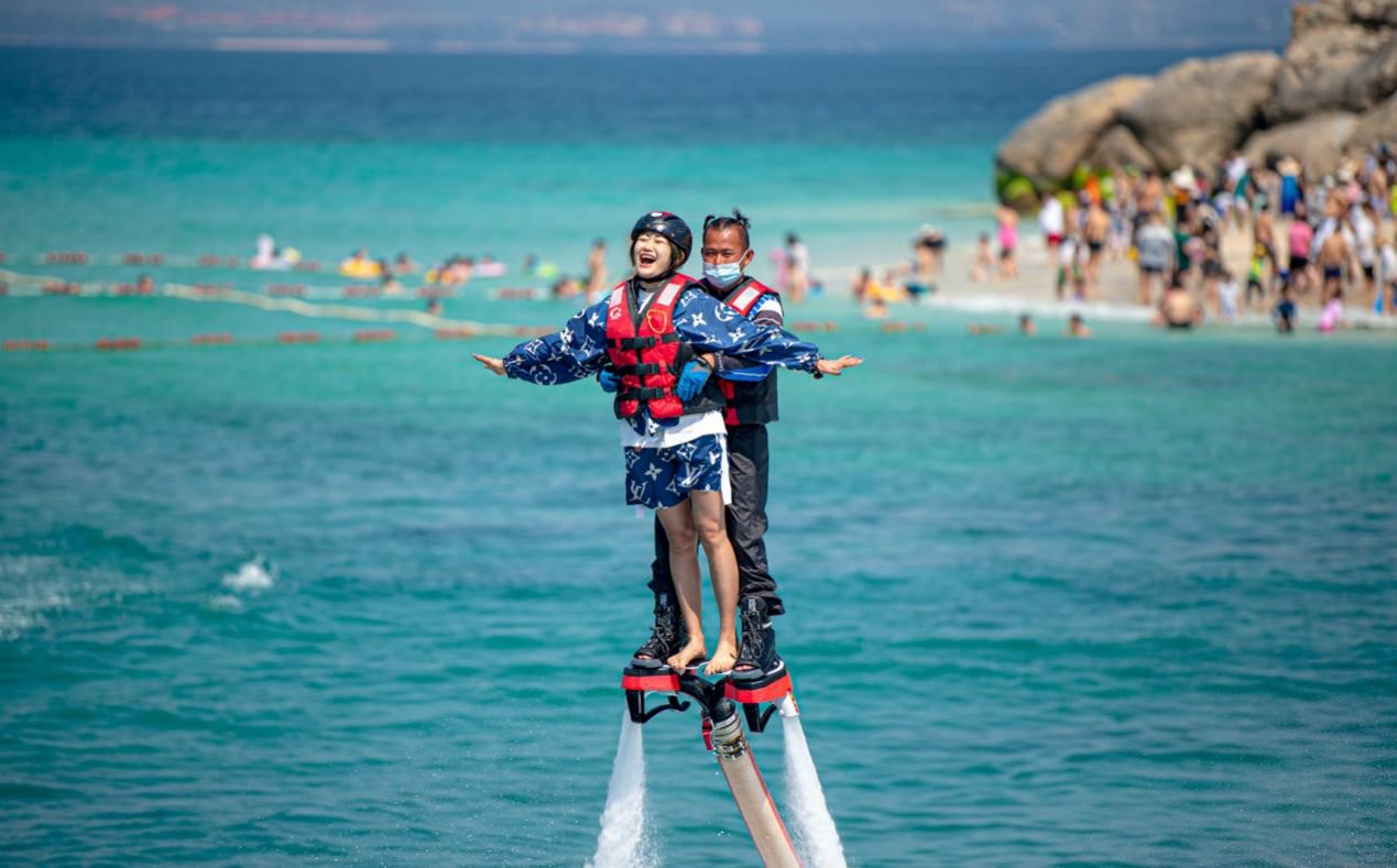 A young woman experiences hydroflighting in Wuzhizhou Island, Sanya, south China's Hainan Province during the Spring Festival holiday, Feb. 15. (Photo by Yuan Chen/People's Daily Online)