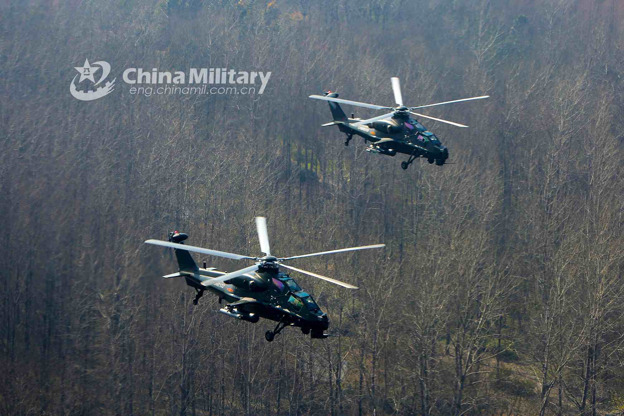 WZ-10 attack helicopters attached to an army aviation brigade under the PLA 72nd Group Army fly over the trees during a formation flight training exercise on February 18, 2021. (eng.chinamil.com.cn/Photo by Sun Mingjian)