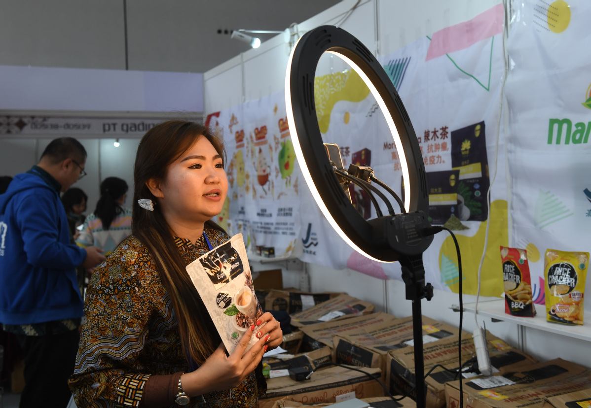 An exhibitor promotes imported goods via livestreaming during the 17th China-ASEAN Expo held in Nanning, Guangxi Zhuang autonomous region, in November, 2020. [Photo/Xinhua]