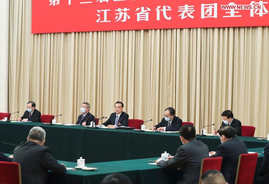 Chinese Premier Li Keqiang, also a member of the Standing Committee of the Political Bureau of the Communist Party of China Central Committee, joins the Jiangsu delegation in deliberation at the fourth session of the 13th National People's Congress (NPC) in Beijing, capital of China, March 7, 2021. (Xinhua/Yao Dawei)