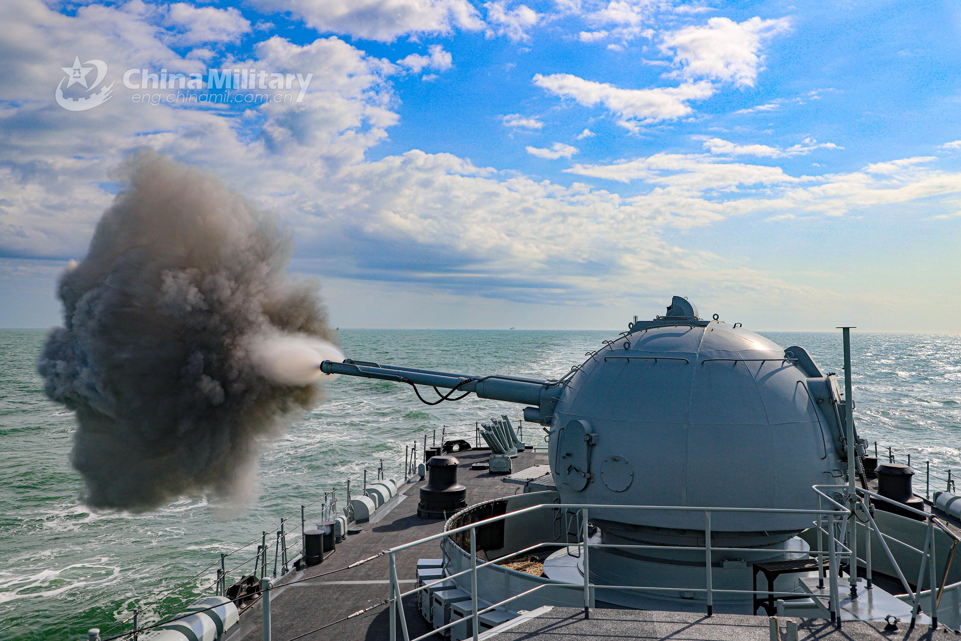 The guided-missile destroyer Taiyuan (Hull 131) attached to a naval destroyer flotilla under the PLA Eastern Theater Command fires its main gun at mock sea target during a maritime live-fire operation in waters of the East China Sea in late January, 2021. (eng.chinamil.com.cn/Photo by Li Ning)