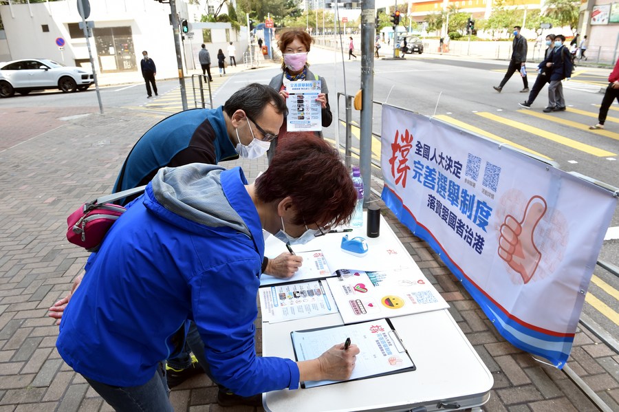 Citizens sign their names during a campaign in support of the decision on improving the electoral system of the Hong Kong Special Administrative Region by the National People's Congress (NPC) in Hong Kong, south China, March 11, 2021. (Xinhua/Lo Ping Fai)