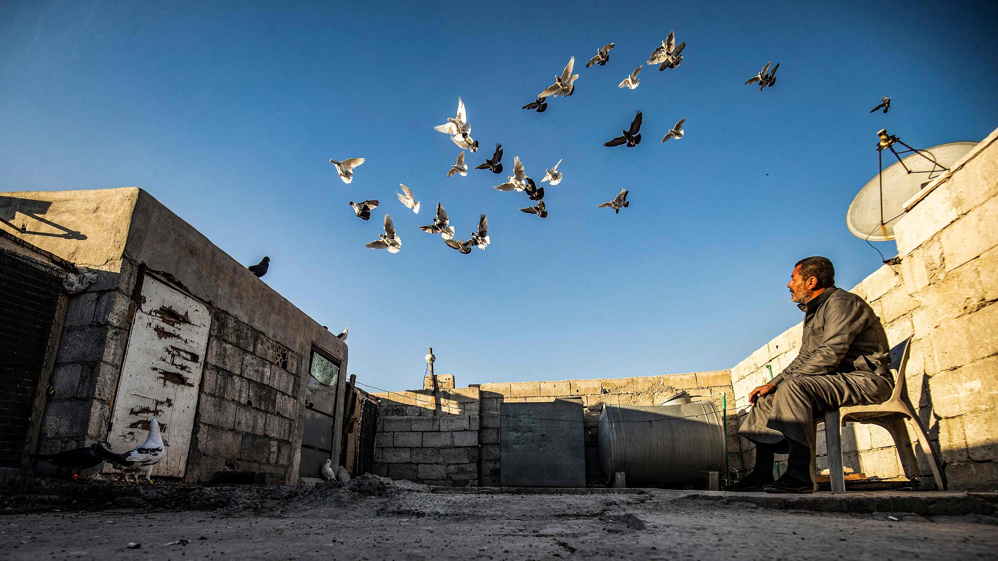 Abdulhamid Hana, a 50-year-old Syrian pigeon keeper, watches his birds on the roof of his home in Syria's eastern city of Raqa on March 13, 2021. /Xinhua