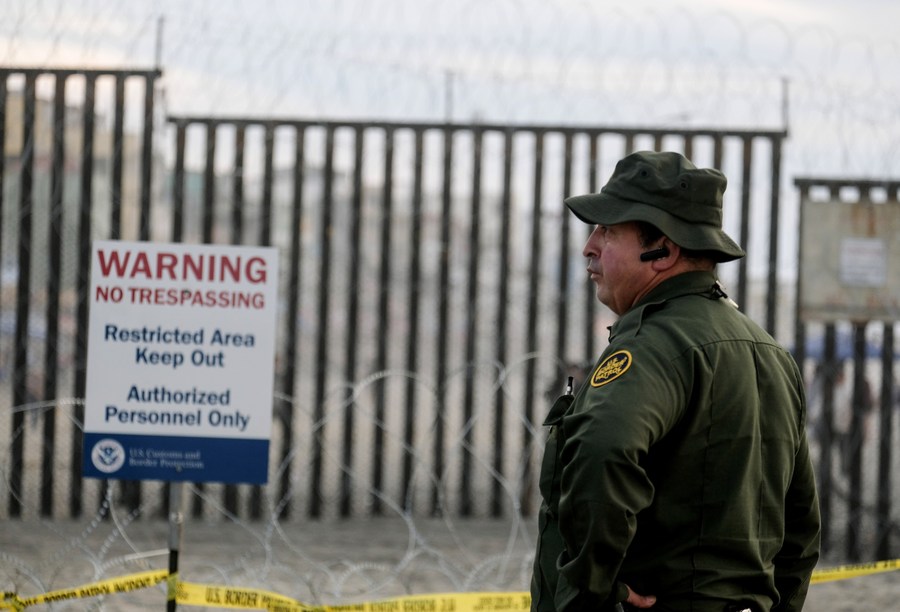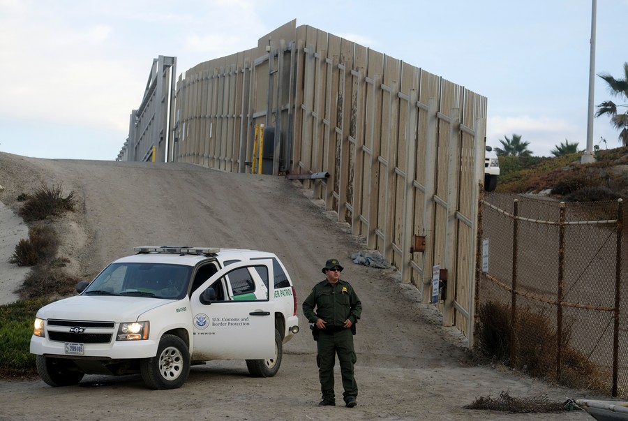 A U.S. Border Patrol agent stands in front of the border fence that divides the U.S. and Mexico in San Diego, California, the United States, Nov. 17, 2018. (Xinhua/Zhao Hanrong)