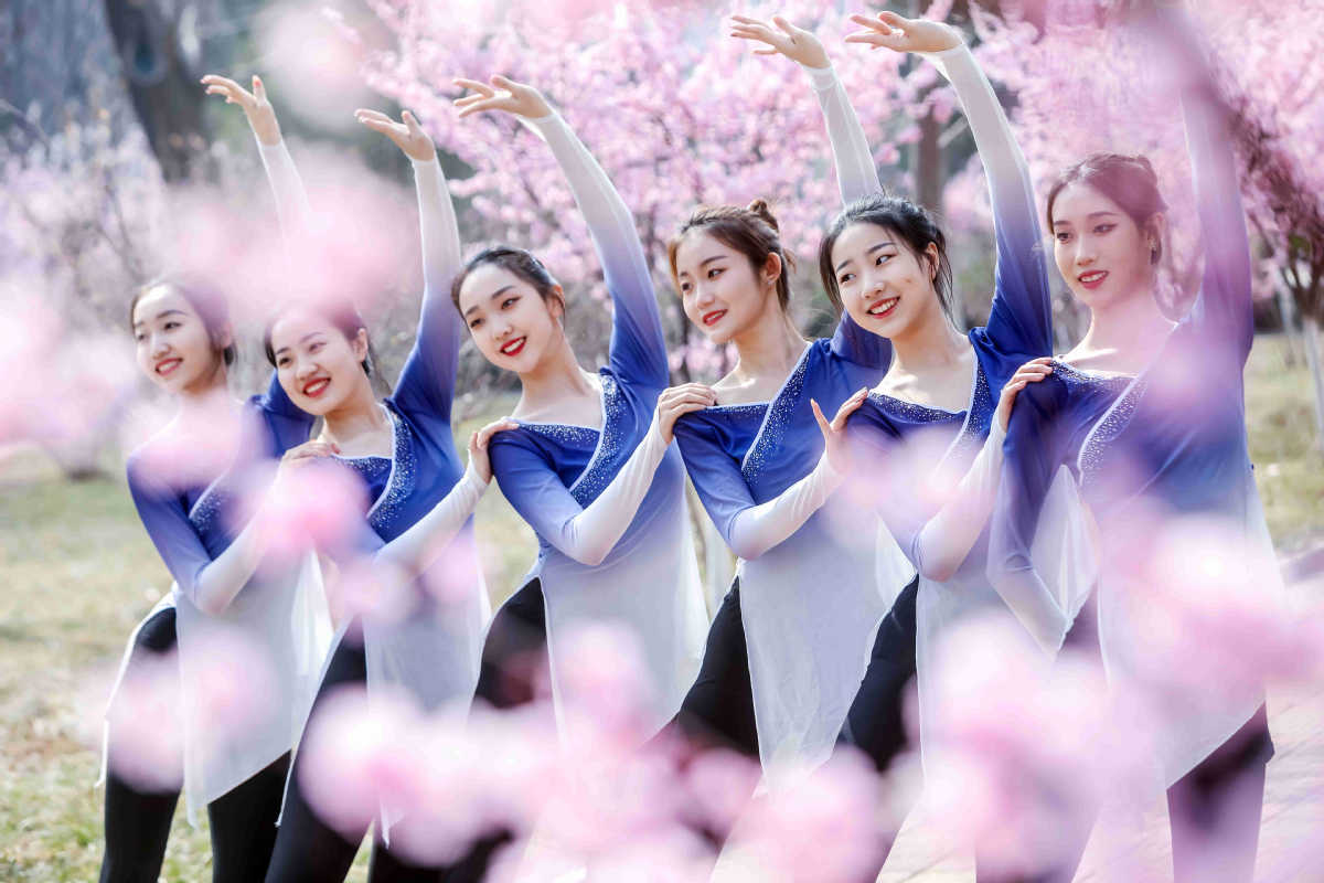 A group of students from the School of Music of Shandong Normal University are seen dancing at the Qianfo Mountain Campus in Jinan, East China's Shandong province against a backdrop of various blooming flowers. [Photo provided to chinadaily.com.cn]