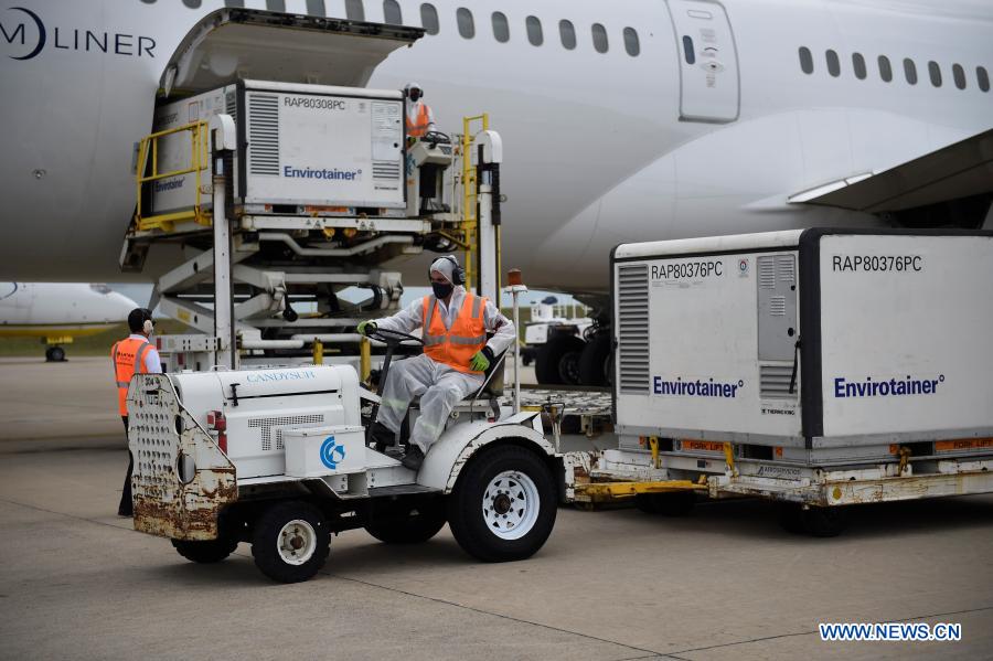 Workers unload vaccines from Chinese pharmaceutical firm Sinovac on its arrival in Montevideo, Uruguay, March 16, 2021. Uruguay on Tuesday received a new batch of CoronaVac vaccines from Chinese pharmaceutical firm Sinovac to bolster its immunization drive against COVID-19. (Xinhua/Nicolas Celaya)