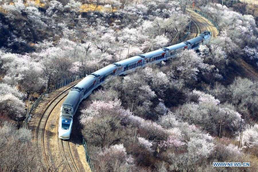Suburban train runs amid blooming flowers near Juyongguan section of Great Wall (2)