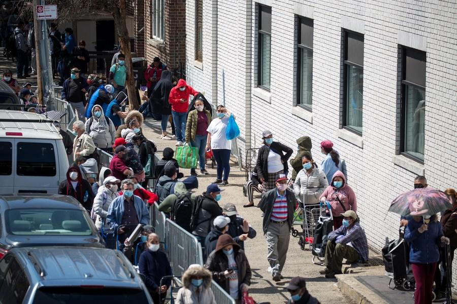 People wait to receive food at a food distribution site in the Brooklyn borough of New York, the United States, May 14, 2020. (Photo by Michael Nagle/Xinhua)