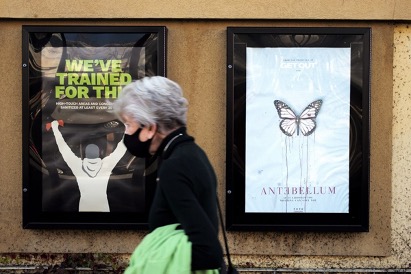 An elderly woman walks past a closed movie theater in San Mateo, California, US, Feb. 24, 2021. (Photo/Xinhua)