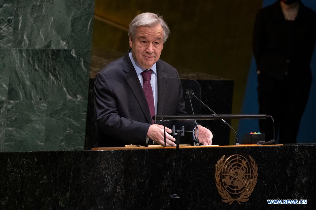United Nations Secretary-General Antonio Guterres addresses the commemorative meeting of the General Assembly to mark the International Day of Remembrance of the Victims of Slavery and the Transatlantic Slave Trade at the UN headquarters in New York on March 25, 2021. (Eskinder Debebe/UN Photo/Handout via Xinhua)