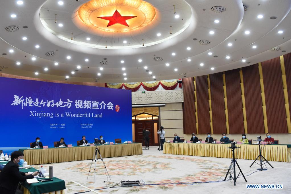 A joint video promotion event for Xinjiang with the Chinese embassy in Britain is held in Urumqi, northwest China's Xinjiang Uygur Autonomous Region, March 26, 2021. (Xinhua/Ding Lei)