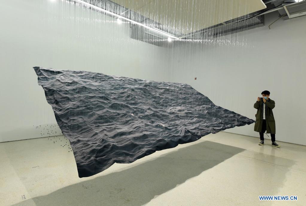 A visitors takes photos of an artwork during the contemporary art show "WAVELENGTH: AT THE MOMENT" at Beijing Times Art Museum in Beijing, capital of China, March 27, 2021. The contemporary art show "WAVELENGTH: AT THE MOMENT" kicked off on Saturday and will last until June 14, 2021, featuring artworks from 18 artists from China and abroad. (Xinhua/Ren Chao)