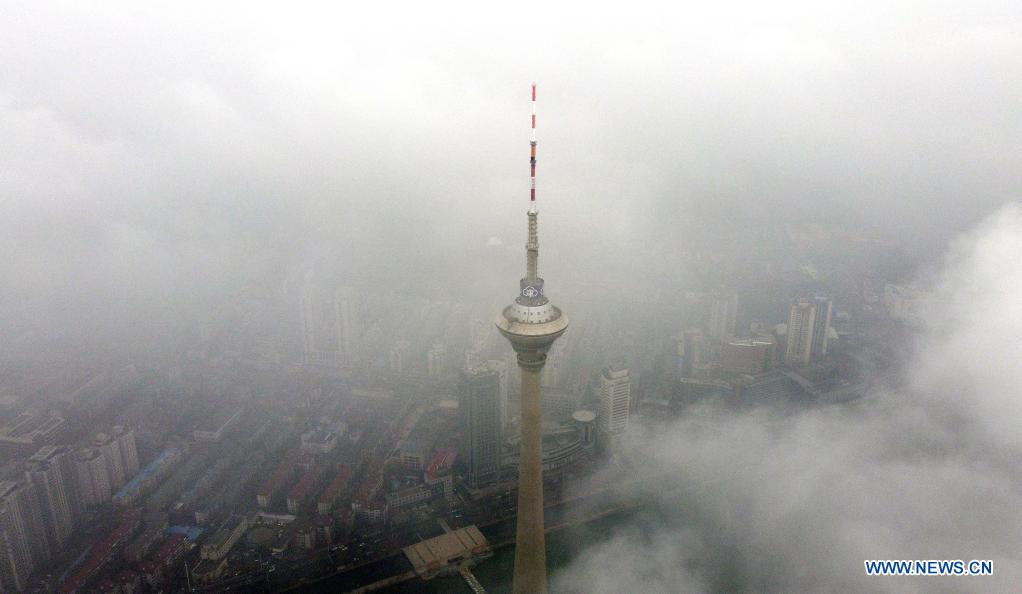 Aerial photo taken on March 27, 2021 shows the landmark Tianjin Television Tower shrouded in fog in Tianjin, north China. (Xinhua/Zhao Zishuo)