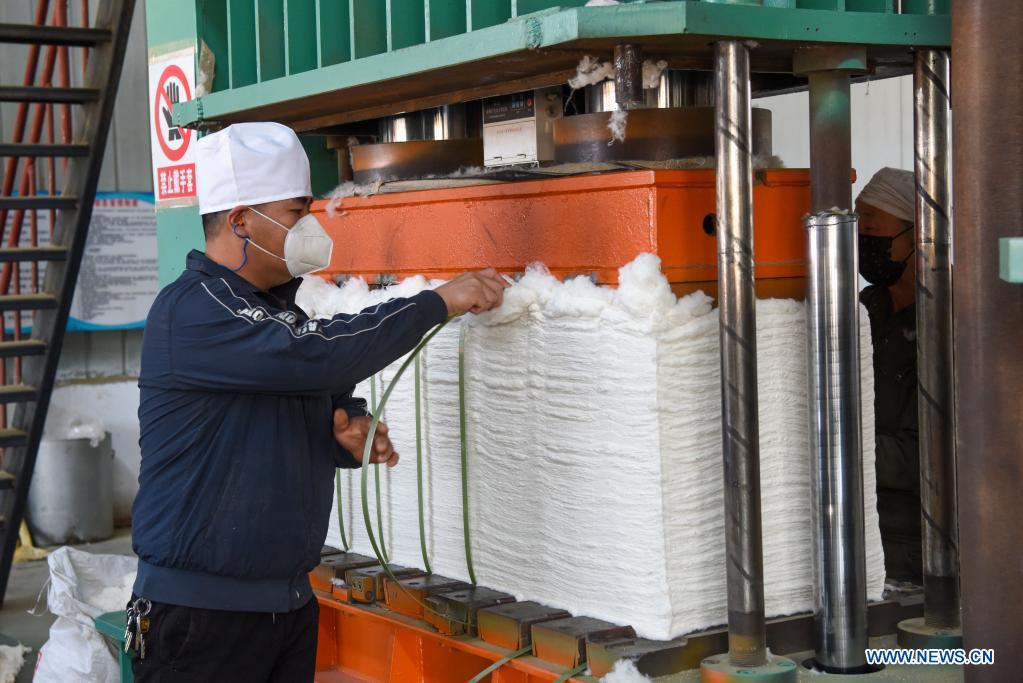 An employee works at a cotton factory in Manasi County, northwest China's Xinjiang Uygur Autonomous Region, Oct. 17, 2020. (Xinhua/Ding Lei)