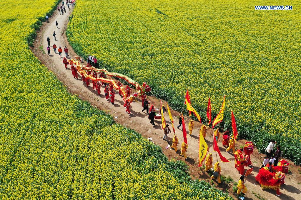 Folk artists perform at the cole flower fields in Baofeng County, central China's Henan Province, March 28, 2021. (Photo by He Wuchang/Xinhua)